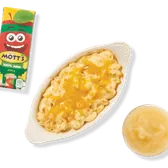 Blend of cheeses folded into elbow pasta topped with cheddar and baked. Served with choice of fruit (45 cal), applesauce (40 cal) or bag of chips (140-300 cal). For kids 12 and under. Includes kid’s fountain beverage (0-170 cal), or apple juice (100 cal).