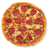 Pepperoni, mozzarella and pizza sauce, topped with basil. 6 slices per pizza.