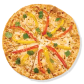 Seasoned shrimp, red and yellow bell peppers, mozzarella, Parmesan, red pepper flakes and chili oil, topped with cilantro. Calories are displayed per slice. 6 slices per pizza.