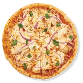 All-natural chicken, red onions, mozzarella, BBQ sauce, topped with fresh cilantro. Calories are displayed per slice. 6 slices per pizza.