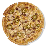 Chicken, our signature white BBQ sauce, bacon, mozzarella and chili oil, topped with jalapeños and a white BBQ sauce drizzle. (N) Calories are displayed per slice. 6 slices per pizza.