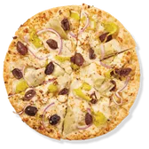 Chicken, Kalamata olives, artichoke hearts, pepperoncinis, red onions, mozzarella, feta and garlic olive oil. Calories are displayed per slice. 6 slices per pizza.