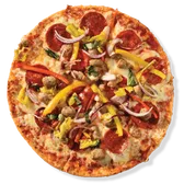 Pepperoni, Italian pork sausage, mozzarella, red and yellow bell peppers, red onions, pepperoncinis, and pizza sauce, with basil. Calories are displayed per slice. 6 slices per pizza.