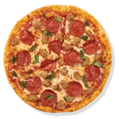 Pepperoni, Italian pork sausage, mozzarella and pizza sauce, topped with basil. Calories are displayed per slice. 6 slices per pizza.