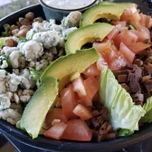 Mixed greens topped with sautéed crispy chickpeas, avocado, crumbled blue cheese, crispy pig-less bacon crumbles, diced tomatoes, and scratch made ranch dressing. Contains: cashews, soy, coconut, gluten, almonds, garlic, onion. Nutritional information: cal 1150, protein 10g, carb 26g, sugar 6g, fibre 8g, fat 39g, sat fat 11g