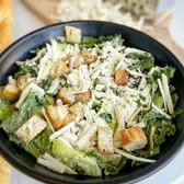 Romaine lettuce topped with house made croutons, grated parmesan, and scratch made cashew caesar dressing. Contains: cashews, coconut, gluten, soy, garlic. Gluten free available Nutritional information: cal 230, protein 7g, carb 22g, sugar 3g, fibre 5g, fat 14g, sat fat 5g