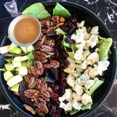 Mixed greens topped with blue cheese crumbles, dried cranberries, candied pecans, diced apples, and scratch made balsamic vinaigrette. Contains: soy, coconut, cashews, onion, garlic. Nutritional information: cal 490, protein 7g, carb 33g, sugar 20g, fibre 5g, fat 39g, sat fat 11g
