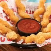 Crispy herb-breaded zucchini sticks fried golden and served with ranch dressing.