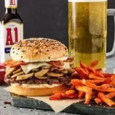Served with your choice of side. Hardwood-smoked bacon, roasted garlic aioli, sautéed garlic mushrooms, Monterey Jack cheese and A.1.® Steak Sauce on a toasted black and white sesame brioche bun.