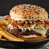 Served with your choice of side. Hardwood-smoked bacon, bleu cheese crumbles, caramelized onions, Monterey Jack cheese and ranch dressing on a toasted black and white sesame brioche bun.