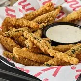 Crispy herb-breaded zucchini sticks fried golden and served with ranch dressing.