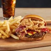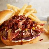 Sweet, tangy BJ’s Peppered BBQ sauce | smoked bacon | crispy onion strings | cheddar cheese | BBQ ranch dressing | premium parker house bun