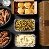 Hand-made dumplins simmered low & slow to tender, pillow perfection. Served with two classic sides and buttermilk biscuits.