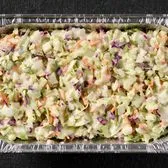 A mix of green cabbage, red cabbage and carrots tossed in a coleslaw dressing.