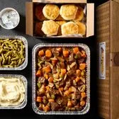 Rib roast simmered low and slow with carrots, onions, and celery in a rich gravy. Served with two classic sides and buttermilk biscuits. We suggest enjoying it with mashed potatoes.
