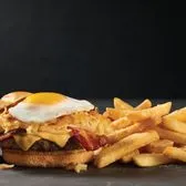 Half pound beef patty, American cheese, our signature hashbrown casserole, bacon, and a sunny-side up egg all on a toasted bun. Comes with one classic side. Available all day.