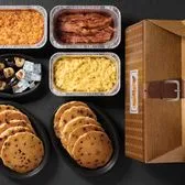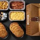 Two farm fresh eggs* and your choice of breakfast meat and two sides, plus biscuits and gravy. We suggest enjoying with coarse ground grits.