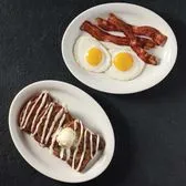 Cinnamon streusel bread griddled golden and topped with rich cinnamon and cream cheese icings. Served with two eggs and choice of breakfast meat.