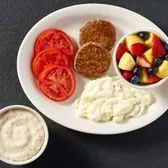 Scrambled egg whites, fresh fruit, sliced tomatoes, choice of breakfast side, and turkey sausage make for a deliciously lighter breakfast. We suggest enjoying with coarse ground grits.