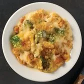 Tender broccoli and seasoned rice baked in a rich cheese sauce, topped with buttery cracker crumbles.