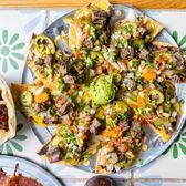 house-made chips topped with beef fajita, refried black beans, american yellow cheese, grilled onion, guacamole, escabeche, pico de gallo