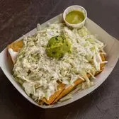 house-made chips topped with refried black beans, american yellow cheese, grilled onion, guacamole, escabeche, pico de gallo