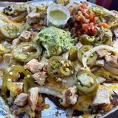house-made chips topped with chicken, refried black beans, american yellow cheese, grilled onion, guacamole, escabeche, pico de gallo