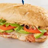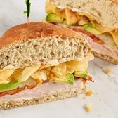 Roasted turkey, bacon, Pepper Jack cheese, avocado, chipotle ranch, spring mix, and tomatoes on toasted baguette.