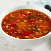 Fire Roasted tomatoes, bell peppers, carrots, zucchini and corn. Simmered in a rich vegetable broth with bite-sized pasta.