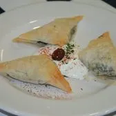 Mixture of spinach, feta cheese and spices wrapped in delicate phyllo dough baked until golden and crispy served with tzadziki sauce