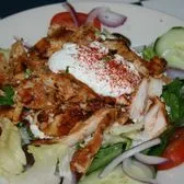 Fresh Chicken on top of fresh romaine and iceberg lettuce, tomatoes, cucumbers, feta cheese, and Kalamata olives Topped with house made Tzadziki & Salad dressing with a side of warm Pita Bread!