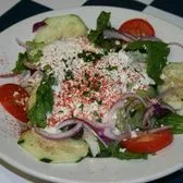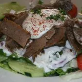 Gyro on top of fresh romaine and iceberg lettuce, tomatoes, cucumbers, feta cheese, and Kalamata olives Topped with house made Tzadziki & Salad dressing with a side of warm Pita Bread!