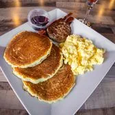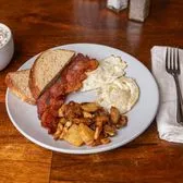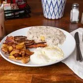 Two eggs, breakfast potato, bacon, sausage patty and a biscuit topped with sausage gravy,