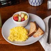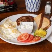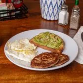 Three eggs, two sausage patties, avocado, tomato, cottage cheese and toast