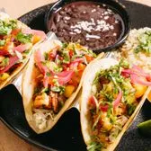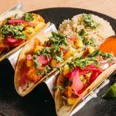 3 Crispy tempura-battered cod topped with fresh mango salsa, crunchy slaw, chipotle crema, pickled onions, and cilantro