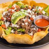 Choose from: ground beef, pulled or fajita chicken on a bed of fresh romaine lettuce. Topped with avocados, grape tomatoes, black beans, roasted corn, cheddar and Monterey Jack cheese in our homemade tortilla shell with homemade ranch on the side