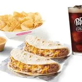 Two Ground Beef Tacos, chips & queso and a 20 oz. drink.