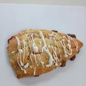 A tender, European-style scone with a lightly crisp exterior and soft, buttery crumb, filled with sweet strawberries and delicate cream, then finished with a light drizzle of white chocolate for an elegant touch.