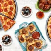 2 Large 1 topping Pizzas, 1 Meatball Dunkers, Choice of 1 Saucy Meatballs & 4 Beverages. Feeds 6-8
