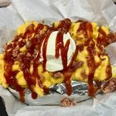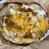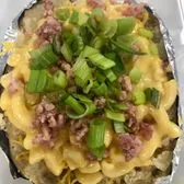 One of our biggest spuds! Butter, Cheddar Cheese, Brisket, Mac n Cheese topped with BBQ sauce, Bacon Bits, and Sour Cream! You won’t be disappointed