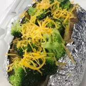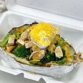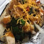 Teriyaki meat of your choice (chicken or steak), butter, Cheddar cheese, steamed broccoli, sauteed bell peppers topped with sauteed onions