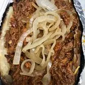Smoked chopped brisket with BBQ sauce, butter, Cheddar cheese topped with sauteed onions