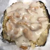 Chicken fried steak, butter, Cheddar cheese topped with country gravy and a slice of Texas Toast