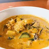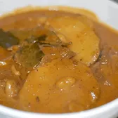 Gluten Free. Thai-Indian red curry with bay leaves, onions, potatoes & peanuts.