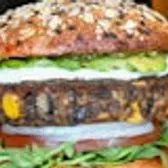 Black Bean & Corn Patty topped with Goat Cheese, Avocado, Arugula, Tomato, Onion, Chipotle Aioli, & Basil Pesto Sauce on a Whole Wheat Bun