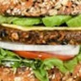 Black Bean & Corn Patty topped with Vegan Gouda Cheese, Avocado, Arugula, Tomato, Onion, Vegenaise, Basil Pesto Sauce on a Whole Wheat Bun