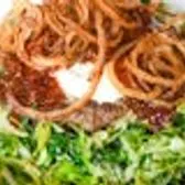 House greens tossed with apple cider vinaigrette, tomato & onion, Force of Nature 100% Grass-Fed Pasture Raised Bison, Crispy Onions, Goat Cheese & Cherry & Fig Honey Jam