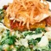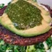 House greens tossed in oregano lemon vinaigrette, topped with 100% Grass-Fed Pasture-Raised Beef, sweet potatoes, cucumbers, tomatoes, pickled red onions, avocado & spicy garbanzo beans with whipped jalapeño-cilantro goat cheese