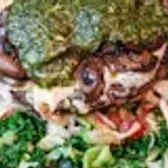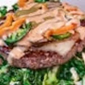 House Greens tossed with Apple Cider Vinaigrette, Tomato & Onion, topped with a Beef Patty, Creamy Goat Cheese, Field Mushrooms & Basil Pesto Sauce. This item is gluten friendly. If you have an allergy, please let the kitchen know.