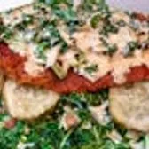 House Greens tossed with Apple Cider Vinaigrette, Tomato & Onion, topped with a Hand-Breaded Crispy Fried Chicken breast (Nashville Hot or Not), slaw & pickles.